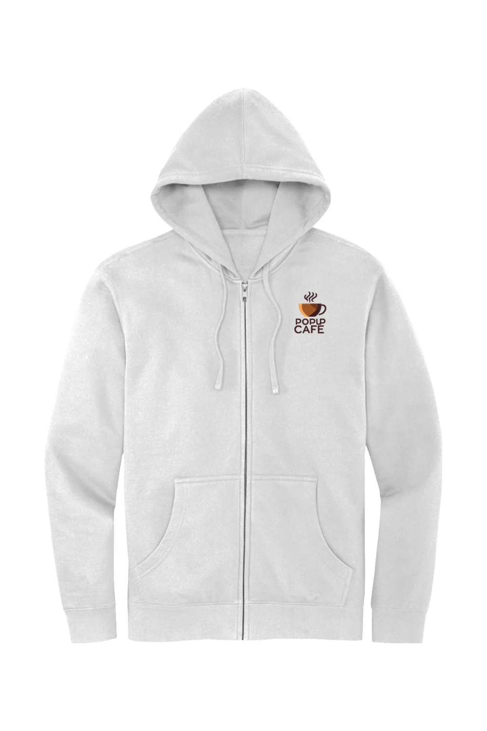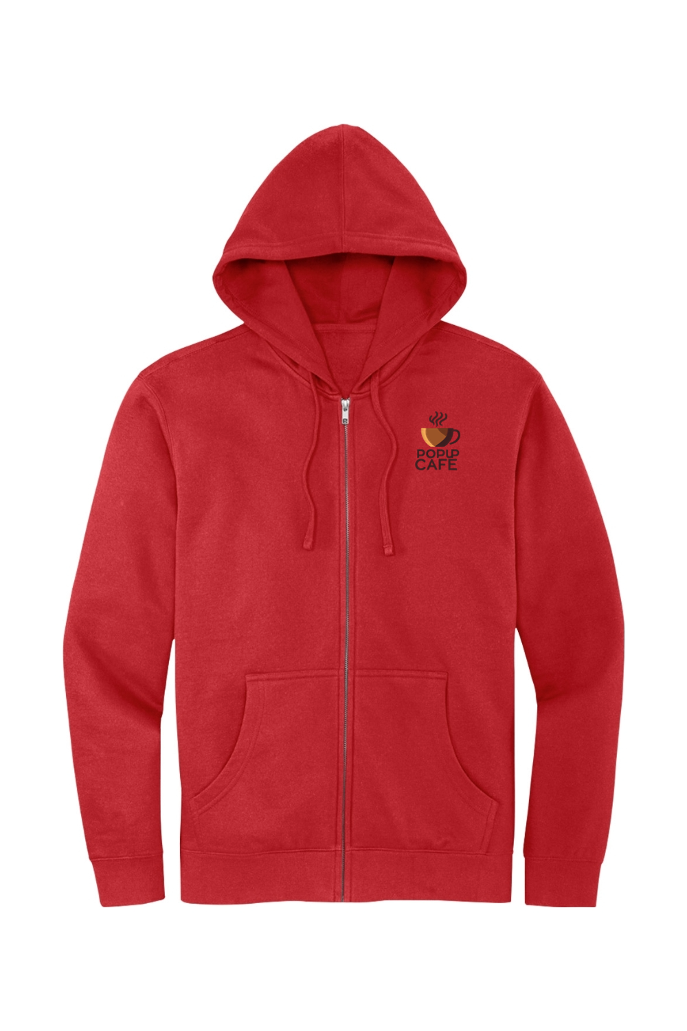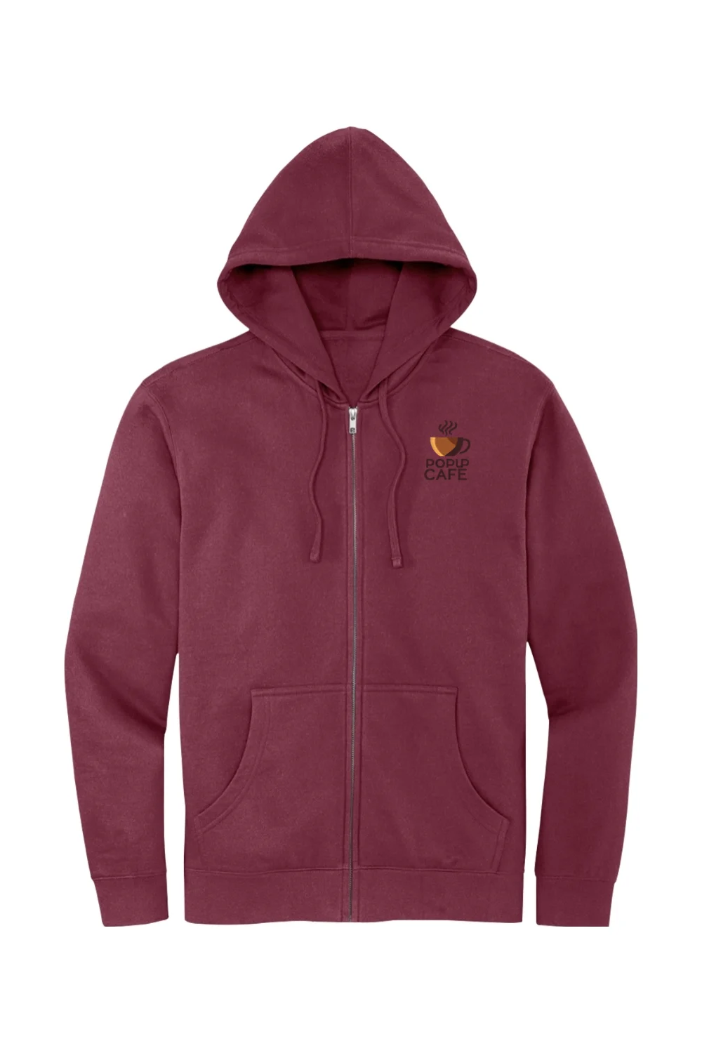 Your New Everyday Favorite. Stay cozy and effortlessly stylish with this ultra-soft full-zip hoodie. Made from a breathable cotton-blend fleece, it offers the perfect balance of comfort and warmth for year-round wear. The clean design features a jersey-lined hood, front pockets, and a smooth zipper — perfect for layering or wearing solo. Whether you’re running errands or relaxing on the weekend, this hoodie has you covered. The Popup Cafe logo is embroidered on the left chest, adding a premium, long-lasting touch to this everyday essential.
